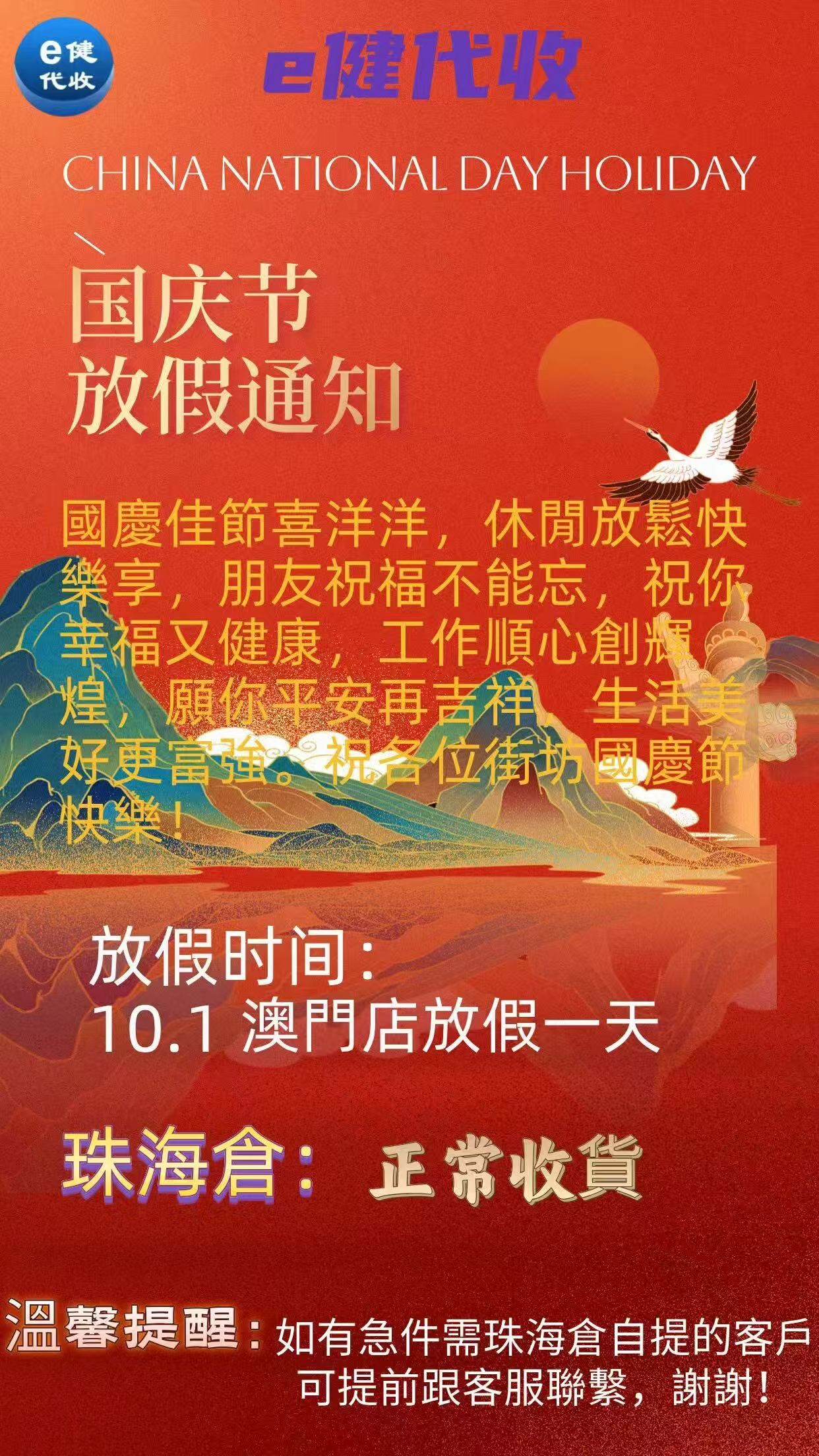 國慶節 澳門店休息一天 (珠海倉正常收件) (樂富店2-4號休息,1號有開,貨物會安排翡翠店取貨))